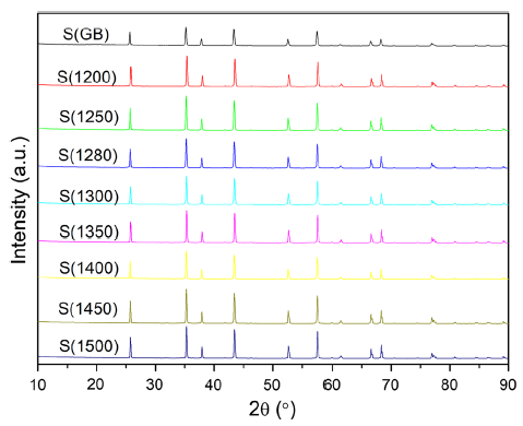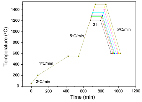 The green bodies were debinded in a muffle furnace (HEFEI KE JING MATERIALS TECHNOLOGY CO., LTD. China). Firstly, the green bodies were heated to 200 °C with a heating rate of 2 °C/min. Secondly, the samples were heated to 550 °C with a heating rate of 1 °C/min and then maintained for 2 h. Thirdly, the samples were heated to the target temperatures (T) with a heating rate of 5 °C/min (T = 1200, 1250, 1280, 1300, 1350, 1400, 1450, 1500 °C). The heating was sustained for 2 h. The debinding and sintering atmosphere was air. The debinding and sintering profiles are illustrated in Fig. 2. The samples were denoted as S(T).