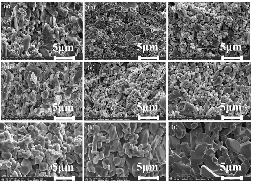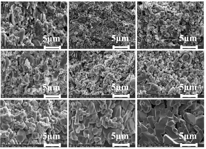 Fig. 5 SEM images of the green body and of the samples sintered at different temperatures: a green body; b 1200 °C; c 1250 °C; d 1280 °C; e 1300 °C; f 1350 °C; g 1400 °C; h 1450 °C; i 1500 °C
