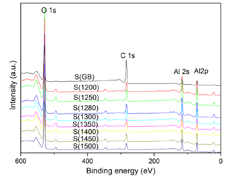 The XPS spectra are shown in Fig. 10, where the binding energies at 527.9 eV, 281.0 eV, 115.7 eV and 71.1 eV represent the O 1s, C 1s, Al 2s and Al 2p, respectively. The element analysis acquired from XPS is shown in Table 3. For the green body, a much higher C content was detected because there was some polymer residue in the sample. This phenomenon was consistent with EDS results. The C, H and Al contents in different samples were almost the same. The O/Al ratio was very close to 1.5 of the theoretical values of Al2O3 [42]. EDS is used to measure the bulk content, while XPS is used to measure the content within 10 nm of the sample surface. Hence, the carbon content of the sample is greatly affected due to the surface pollutants. However, it is observed that the carbon content of the unsintered green sample is significantly higher than that of the sintered sample.