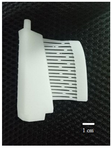 After sintering at 1280 °C, the shrinkage along length, wide and height directions is 2.1%, 2.3% and 3.8%, respectively. The open porosity, water absorption, bulk density, relative density and crystallite size are 37.6%, 15.2%, 2.44 g/cm3, 61.9% and 43.8 nm, respectively. These properties satisfy the material requirements of the ceramic core [45]. Excessive shrinkage and high density are not desirable for directional solidification or single crystal casting of superalloys and eutectic alloys [46]. This is because the shrinkage inhibits the control of the shape and position tolerance of the core. The coefficient of thermal expansion of alumina is lower than that of metal. When molten metal solidifies, the aluminum core with high density and high elastic modulus has strong ability to resist compression deformation. This facilitates the formation of mechanical cracks or thermal tearing of alloy castings. In addition, a higher density leads to lower dissolubility, which makes the core removal more challenging. Therefore, considering that the samples sintered at 1280 °C have appropriate flexure strength (24.0 MPa), sufficient porosity (37.6%) and small shrinkage (2.1% in length, 2.3% in width, 3.8% in height), 1280 °C is the best sintering temperature. The printed alumina ceramic core is shown in Fig. 12.