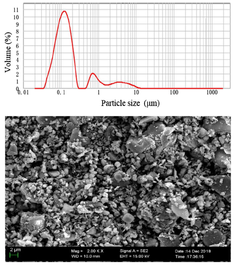 Fig. 1 Particle size distribution of Al2O3 powders and the SEM image of Al2O3 powders