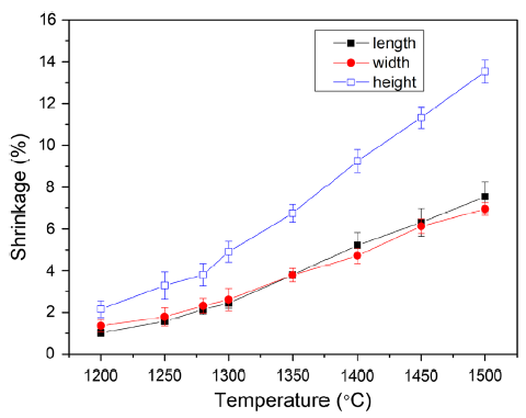 The shrinkage of the sintered samples is shown in Fig. 3, where it is observed to increase in all the three directions as the sintering temperature is increased. Along the length direction, width and height directions, the shrinkage is in the range of 1.0-7.5%, 1.4-6.9% and 2.2-13.5%, respectively. It is also observed that the shrinkage along length direction is approximately equal to the shrinkage of the width direction. However, the shrinkage along the height direction is nearly two times compared to the length and width directions. The different magnitudes of shrinkage in the three directions can be explained as follows: on the one hand, the bottom of the crucible which was in contact with the height side of the sintered samples hindered the free crystal growth of the samples in that direction. On the other hand, the green samples were fabricated using a layer-by-layer mode. The different curing depth conditions of height direction compare with length and width direction may lead to the different shrinkage [32]. The heterogeneous green parts can lead to different shrinkage in the three directions.