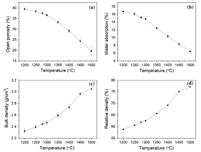 Fig. 4 Variation of the open porosity, water absorption, bulk density and relative density of the sintered samples: a open porosity; b water absorption; c bulk density; d relative density with temperature