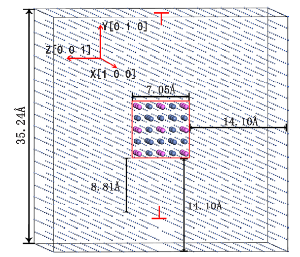 To study the γ/γ′ interface of superalloy in MD simulations, we constructed four atomic models: coherent Ni/Ni3Al interface model with and without a dislocation in Ni matrix, pure Ni model and pure Ni3Al model. The periodic supercell shown in Fig. 1 contains 2 × 2 × 2 Ni3Al (γ′ phase) embedded in the 10 × 10 × 10 Ni matrix (γ phase). Also, an edge dislocation within matrix along the x [100] axis was added, leading to a coherent interface model with matrix (γ phase) dislocation. The supercell has 3970 atoms in total containing 3943 Ni atoms and 27 Al atoms, respectively. Under coherent model approximation, atoms are arranged at FCC sites so that there is no lattice misfit between Ni and Ni3Al in the initial configurations. Moreover, the orientations of crystal lattices in the models were arranged along the [100], [010] and [001] directions as indicated in Fig. 1. In order to reduce the influence of interaction between interfaces, we chose a model with a small Ni3Al volume fraction. The Ni3Al models of different sizes (1 × 1 × 1, 2 × 2 × 2 and 3 × 3 × 3) were built to investigate the size effects of Ni3Al on the mechanical behavior of materials.
