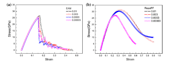 Stress-strain curves of pure Ni at various tensile rates 0.01, 0.003, 0.0003 and 0.00003/ps: a EAM, b ReaxFF