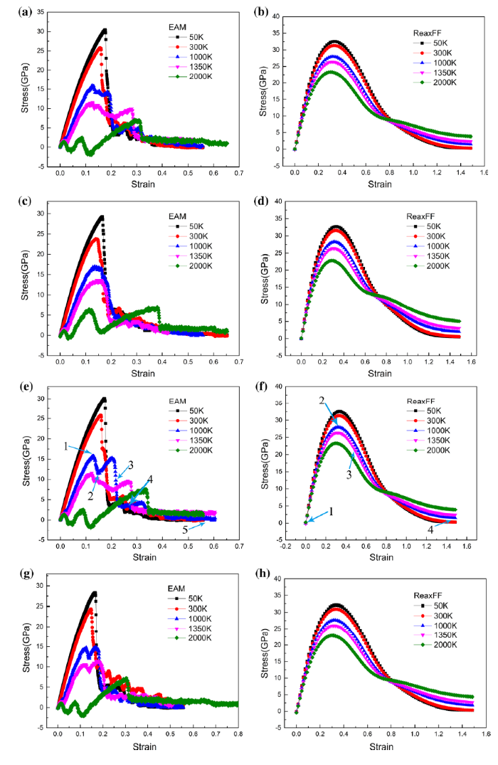 During the MD simulations, all the systems were equilibrated for 10 ps with a time step of 1 fs under the NPT ensembles at 50, 300, 1000, 1350 and 2000 K and 1 atm pressure after energy minimization. After the NPT equilibration, tension with increasing strain was applied along [100] direction at a strain rate \(\dot{\varepsilon } = 3 \times 10^{9}\) s-1. The other strain rates 10 × 109 s-1, 0.3 × 109 s-1 and 0.03 × 109 s-1 were also applied to examine the effects of strain rate. The temperatures of the systems remained invariant at 50, 300, 1000, 1350 and 2000 K throughout the tension simulations. The LAMMPS code [39] with EAM and ReaxFF potentials was used for the MD simulations, and Ovito [40] software was used as a visualization tool for the microstructure analysis in this study.