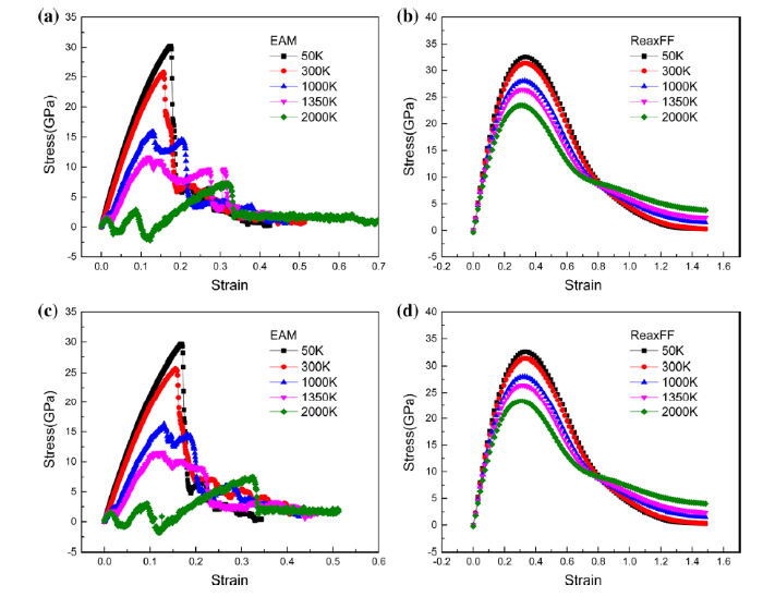 Stress-strain curves of tension simulations using the EAM and the ReaxFF at various temperatures (50 K, 300 K, 1000 K, 1350 K and 2000 K) for the Ni/Ni3Al models with two different γ′ phase sizes: a and b 1 × 1 × 1 γ′ phase, c and d 3 × 3 × 3 γ′ phase