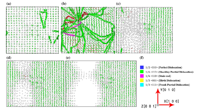 To understand the microscopic mechanisms of deformation and fracture, it is critical to examine the microstructure evolutions at an atomistic scale from the snapshots of MD simulations. Figure 5a-e shows the microstructures of Ni/Ni3Al interface at several typical stages corresponding to the critical points of the stress-strain curves during the EAM tension simulations at 1000 K.