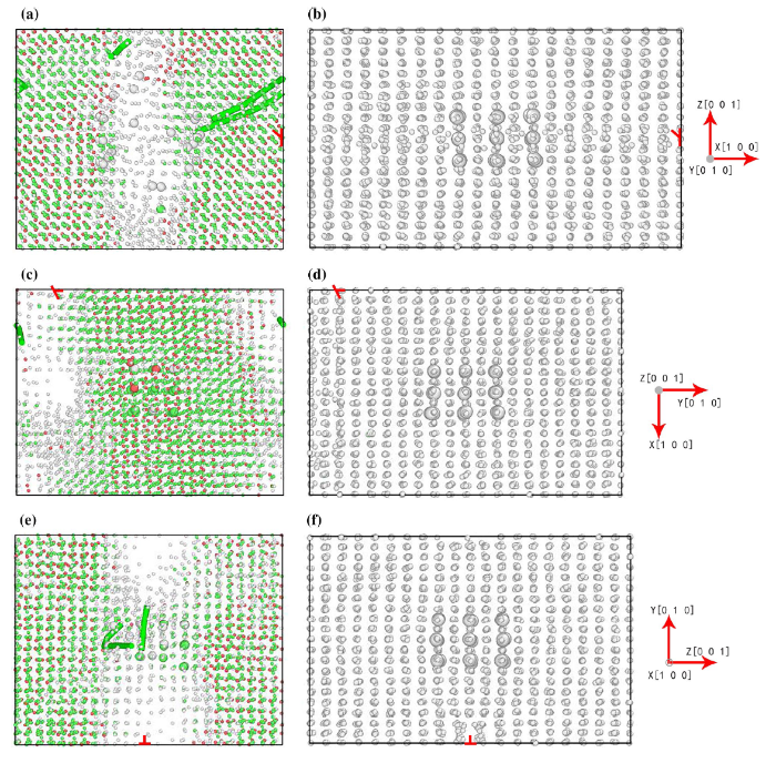 We found that the tension along the different directions led to the varied fracture positions via EAM. The dislocation was initially set along x [100] direction. If the stretching direction is x [100], same as the dislocation direction, the dislocation had little influence on the fracture position, as shown in Fig. 7a. The cracks were still generated in the γ phase near the interface and propagated into the γ′ phase. If the tensile directions were y [010] and z [001], perpendicular to the dislocation, the fracture occurred in γ phase, as shown in Fig. 7c, f. The ReaxFF simulations always showed amorphous lamellar structures for various tension directions.