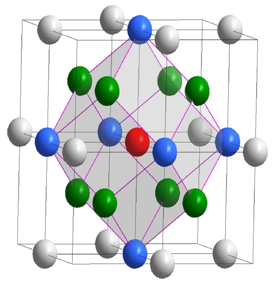Geometrical configuration of the cluster-plus-glue-atom model for BCC structure, centered by red atom Mo, and shelled by 14 Ti is a rhombic-dodecahedral cluster [Mo-Ti14]. The eight nearest neighbors are shown as green balls, and the six second nearest neighbors are shown as blue balls. The glue atoms locate at the next outer-shell of twelve atoms (gray balls). The Ti-Mo monotectoid alloy Ti88Mo12 is modeled as a [Mo-Ti14] cluster glued with one Mo atom (out of the 12 available gray sites), formulated as [Mo-Ti14]Mo = Ti14Mo2 = Ti87.5Mo12.5