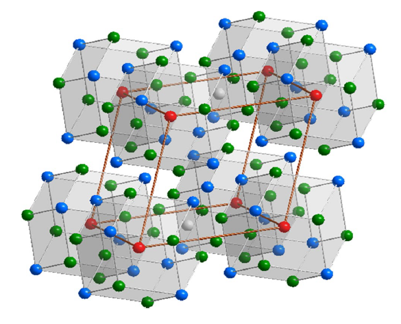 Parallelepiped super-cell unit satisfying the cluster formula [Mo-Ti14]Mo (monotectoid alloy), defined by linking the [Mo-Ti14] cluster center (red atoms, Mo) as the cell vertices. There is only one Mo glue atom (gray atoms) in the unit. The cluster shell atoms are represented by green and blue atoms