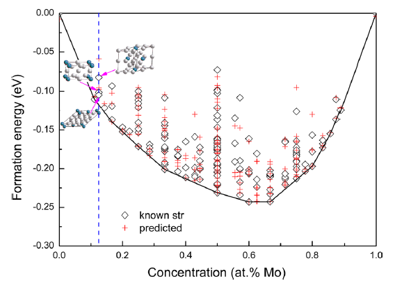 The formation energy of Ti-Mo alloys for each generated structure is searched by CE method with ATAT as a function of Mo concentration and is shown in Fig. 3. The “known str” denotes structures whose energy has been calculated from first principles. The “predicted” denotes structures that are predicted by the cluster expansion, but still not confirmed by first-principles-based calculations. There are three stable structures for the alloy with 12.5% Mo as described in Fig. 4. The first, second and third nearest neighbors of the central Mo atom or Ti atom corresponding to three different structures are listed in Table 1. There are 8 nearest-neighboring Ti atoms and 6 s nearest-neighboring Ti atoms centering any Mo atom in the structural unit [MoTi14]Mo, forming a two-shell cluster according to the cluster-plus-glue-atom model. Glue Mo atoms are located at the next outer-shell (third nearest neighbors).