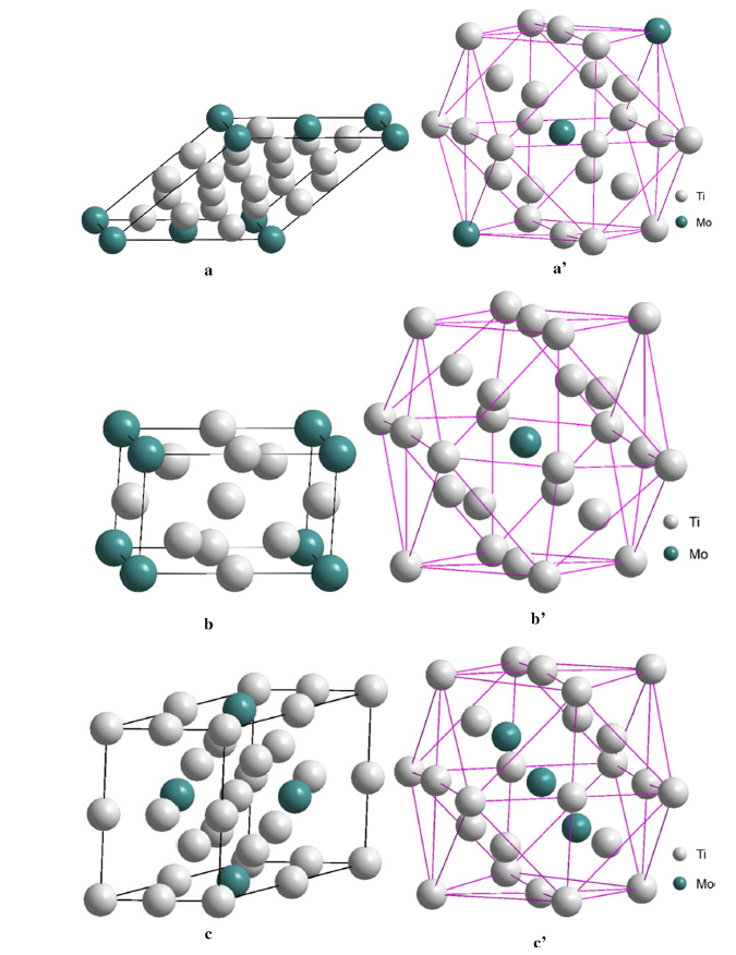 Structures of Ti87.5Mo12.5 obtained by ATAT (a′, b′, c′ show the 1st, 2nd and 3rd nearest neighbor of Mo atom for a, b, c)