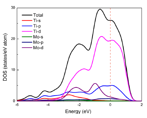 As shown in Fig. 5, the d states of Ti atoms dominate the total electron density of the states of Ti-Mo monotectoid alloy rendering the contribution from Mo atoms negligible. Low Mo content in the alloy (12.5% only), coupled with strong shielding effect over the central Mo atom by the surrounded solvent atoms of Ti, is the reason behind this dominance of Ti atoms.