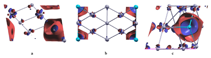 Quantity plots of the difference charge density for structures a, b, c. Isovalues: 0.005 and - 0.005 a.u.