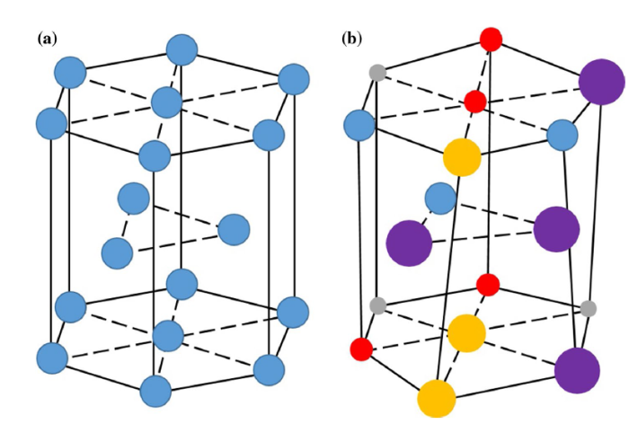 The crystal structure of HCP metals is significantly different from that of FCC and BCC materials, which belongs to the simple hexagonal lattice and have two lattice constants c and a. The metallic atoms are located not only at the junction of the hexagonal prism cell but also in the middle of the unit cell (at a height of c/2). The projection of the central three atoms on the bottom surface is located at the center of gravity of three non-adjacent triangles. In an ideal close-packed structure, adjacent atoms on the (0001) plane are tangent, and the nearest neighbor atoms on the adjacent two (0001) planes are also tangent to each other, so the coordination number is 12 in a HCP unit cell. But in fact, many of the actual HCP metals are only closely packed, and the degree of atomic closeness on each crystal plane changes with the change of the axial ratio c/a. When c/a > 1.63, only atoms in the same (0001) layer are tangent, while those on the adjacent (0001) planes are not tangent, and when c/a < 1.63, it turns to the contrary. The ideal hexagonal close-packed structure is shown in Fig. 1a.
