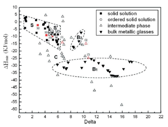 ... After statistically calculating and analyzing, Zhang et al. [19, 22] plotted the relationship between the atomic radius difference and mixing enthalpy, as shown in Fig. 2. The range of the solid solution phase formation is the atomic radius difference is less than 6.5%, and the mixing enthalpy is between - 15 kJ/mol and 5 kJ/mol, just as the S and S′ areas in the figure. The areas where the bulk amorphous structure forms are present in B1 and B2 regions. A large negative enthalpy of formation causes the formation of intermetallics, while a positive enthalpy often results in the phase separation into terminal phases with low mutual solubilities. ...