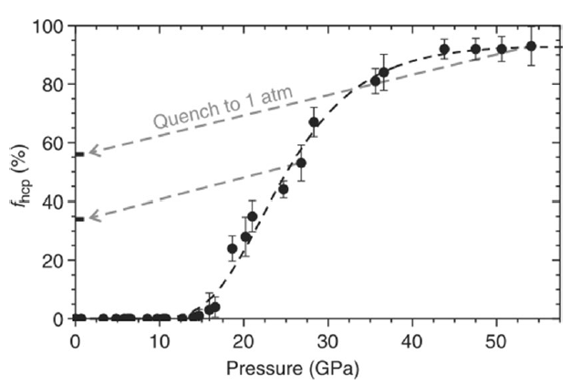 ... Furthermore, HEAs made up of 3D transition elements can also exhibit HCP structures. In 2016, Tracy et al. and Zhang et al. [34, 35] almost simultaneously found that the CoCrFeMnNi HEA can be transformed from FCC to HCP structures under high pressure, and the alloy maintained the HCP structure after reducing the pressure. Their results are shown in Figs. 4 and 5, respectively. In Fig. 4, the CoCrFeMnNi alloy is prepared by arc melting. The alloy exhibits single FCC phase at 14 GPa, and almost all convert to the HCP phase at 54.1 GPa, while in Fig. 5, gas atomization is used, and the alloys are all FCC phase at 19.5 GPa. Then, almost all of them convert to the HCP phase when the pressure increases to 41 GPa. The difference in the critical value of the phase transition may be due to the difference in the preparation method. Both Tracy and Zhang believe that it is the lower stacking fault energy of the HCP structure under high pressures that cause this phenomenon. In addition to the ultra-high pressure, the phase transformation from FCC to HCP structures in CoCrFeMnNi can also be induced by the cryogenic high-pressure torsion [36], and the HCP phase is proved to be stable at low temperatures by thermodynamic calculations.