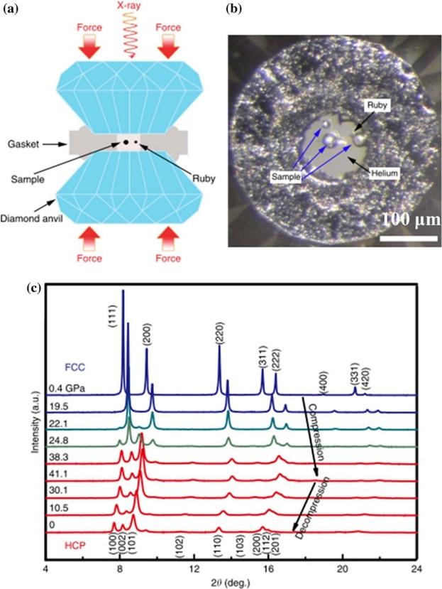 a, b Experimental setup, c the in situ high-pressure XRD patterns of the CoCrFeMnNi HEA [29]