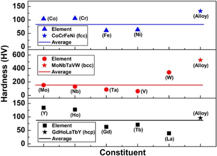 Relationships of hardnesses for three kinds of HEAs, CoCrFeNi, MoNbTaVW, and GdHoLaTbY, and their constituent elements [31]
