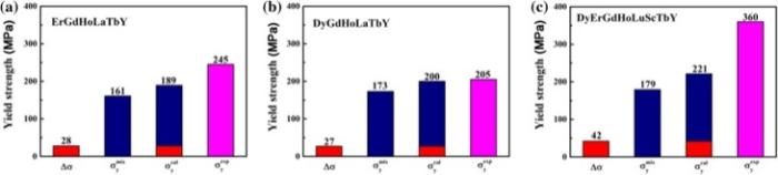 The comparison in the yield stress between calculations and experiments, and the calculated solid solution strengthening value is exhibited in Fig. 7. It indicates that solid solution strengthening provides a lower proportion of total strength, which challenges the fundamental assertion that “solid solution strengthening is the most important strengthening mechanism for HEAs” and is instructive for the future study of the mechanical properties.