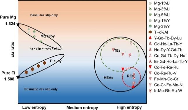Overview of the c/a ratios of Mg alloys, Ti alloys and HEAs exhibiting HCP structure. TE transitional elements, and RE rare earth elements