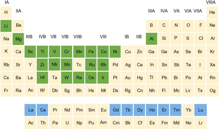 Constituent elements used in the present HCP HEAs. The green areas exhibit the elements used in the first generation of HCP HEA, and the blue areas correspond to the second generation