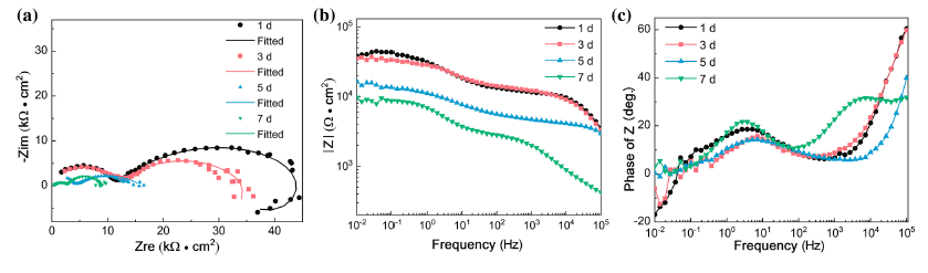 | Fig. 10 Electrochemical results of a Nyquist, b Bode plots of Zmod, c Bode plots of phase angle of the coating after immersion in 3.5% NaCl solution for a few days |