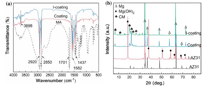 | Fig. 4 a FTIR spectra and b XRD results of the AZ31 substrate, myristic acid (MA) and coated samples as well as immersed AZ31 (I-AZ31) and coating (I-coating) |