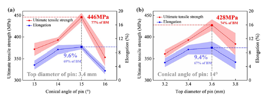 | Fig. 10 Ultimate tensile strength and elongation of joints: a various conical angles of pins at the top diameter of 3.4 mm, b various top diameters of pins at the conical angle of 14° |