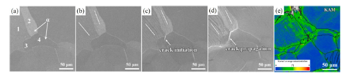 SEM observation of crack initiation in Ti-6Al alloy [46]: a initial, b 0.2 mm, c 0.3 mm, d 0.4 mm and e KAM map after loading to the displacement of 0.4 mm