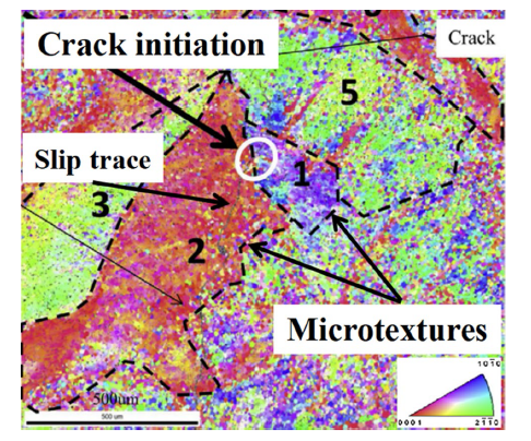 In addition, microtexture also has a significant effect on crack nucleation [122,123]. Zhang et al. [124] investigated fatigue crack nucleation in Ti-6Al-4V alloy during cycle fatigue loading and found that the interface consisting of two soft microtextures would promote crack nucleation (Fig. 14). This is because slip could easily transfer across the whole area of soft microtextures and arouse a remarkable dislocation pile-up on the microtexture-microtexture boundary to generate a large stress concentration.