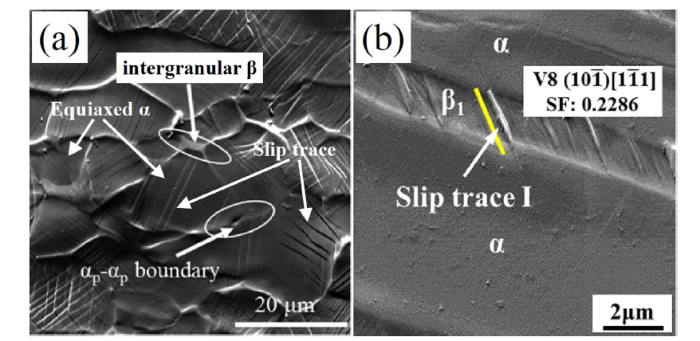 Effect of α grain size and morphology on the deformation mechanism in TC21 titanium alloy [45]: a the localized deformation within equiaxed α and α lath, b comparison of the frequency of slip traces within equiaxed α and α lath