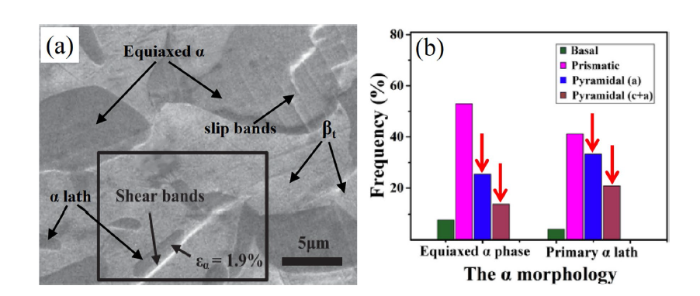 For titanium alloys, the thermomechanical processing could fabricate various microstructures with different deformation mechanisms. Some previous works revealed an effect of α grain size and morphology on slip initiation in α phase. Li et al. [69] investigated the deformation mechanism of a duplex microstructure consisting of equiaxed α grain and α colony in Ti-6Al-4V alloy and found that much fewer slip systems were initiated in lamellar α phase compared to equiaxed α grain. This is because that the small thickness of lamellar α phase restrains the nucleation and proliferation of dislocation [69,85]. In the complex microstructure consisting of fine α lath, coarse equiaxed α grain, and βt structure (Fig. 5a [45]), Tan et al. [45] reported that the pyramidal slip system tended to be initiated in α lath rather than equiaxed α grain (Fig. 5b). For α lath, as shown in Fig. 5a, it is easier to form shear band than equiaxed α grain during deformation, and then, the resulting high stress concentration would promote the initiation of pyramidal slip in α lath.