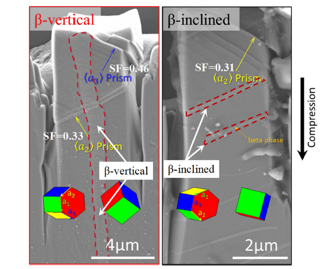 Slip trace analysis of the deformed micropillars with β-vertical (left) and β-inclined (right) structure [86]