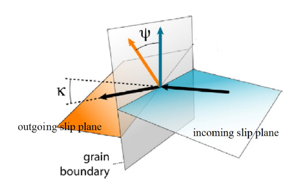 The slip transfer between adjacent grains is associated with the geometrical compatibility of the incoming and outgoing slip systems, as shown in Fig. 7 [87]. Luster et al. [88] proposed that the geometric compatibility factor (