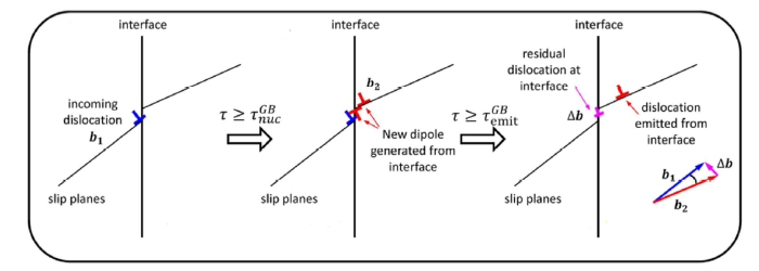 Meanwhile, it has been reported that slip transfer through an interface could be divided into indirect and direct slip transfer. For indirect slip transfer, it is associated with the nucleation of the Frank-Read sources located in front of pile-up dislocations [95,96,97]. For direct slip transfer, pile-up dislocations could be directly transferred to a new slip plane of adjacent grain [95,98,99]. Direct transfer involves dislocation re-nucleation and dislocation emission. As shown in Fig. 8 [95], the motion of the incoming dislocation (b1) was hindered at grain or phase boundaries, resulting in dislocation pile-up and stress concentration. It would induce the formation of a new dislocation (b2) at the interface. Subsequently, driven by the applied stress, b2 could emit from the interface and slip along the new slip plane. But, due to the intrinsic difference between the b1 and b2, a small residual dislocation (Δb) is eventually generated at the interface.