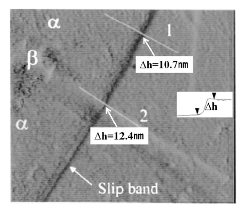 AFM image of slip band and slip step in Ti-6Al-4V alloy during α/β slip transfer when the α and β phases satisfy the BOR [107]